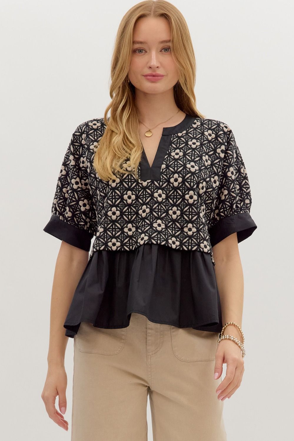 Floral jacquard short sleeve pullover top featuring contrast ruffle hem and band. Unlined. Knit. Non-sheer. Lightweight.