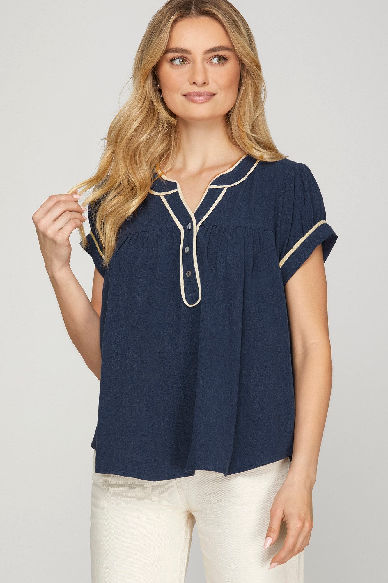 SHORT SLEEVE WITH BRAID TRIM BUTTON DOWN CONTRAST PIPING WOVEN TOP